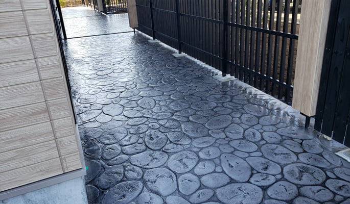 「コンクリート=無機質な灰色」というイメージを変える技術です。コンクリートを流し込む時に、型押しや色付けを行うことで、まるで本物の自然石や木目・レンガのような見た目を作り出す工事です。おしゃれで高級感があるだけでなく、短期間で工事ができ、コストや耐久性の面でも優れています。